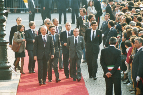 Carlo Bernini, Carlo Fracanzani e alcuni uomini della sua segreteria in piazza Brà a Verona in occasione della visita pastorale di Papa Giovanni Paolo II