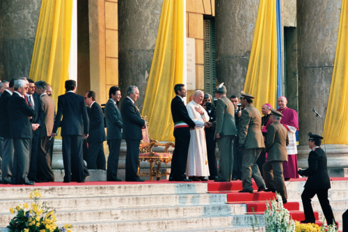 Papa Giovanni Paolo II al termine del suo intervento, saluta le autorità militari locali riunite in occasione della sua visita alla città di Verona; tra le autorità presenti ricordiamo Carlo Bernini Presidente della Regione Veneto, il Vescovo di Verona Giuseppe Amani, il sindaco della città Gabiele Sboarina e Carlo Fracanzani