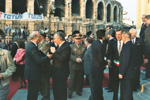 Le autorità civili riunite presso Palazzo Barbieri in occasione della visita pastirale di Papa Giovanni Paolo II a Verona; tra i partecipanti il sindaco di Verona Gabriele Sboarina, il Vescovo di Verona Giuseppe Amani, Carlo Fracanzani e il Presidente della Regione Veneto Carlo Bernini