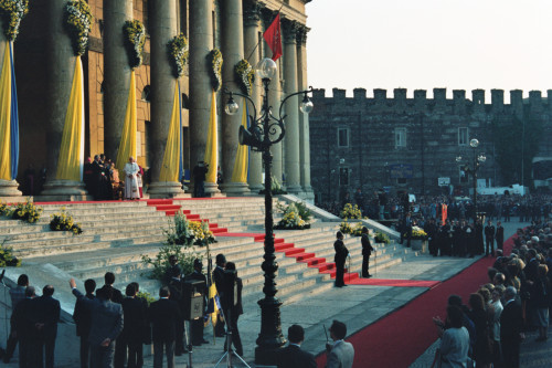 Papa Giovanni Paolo II di fronte Palazzo Barbieri in occasione della sua visita pastorale a Verona; ad accoglierlo il sindaco di Verona Gabriele Sboarina, il Vescovo di Verona Giuseppe Amani, Carlo Fracanzani e il Presidente della Regione Veneto Carlo Bernini