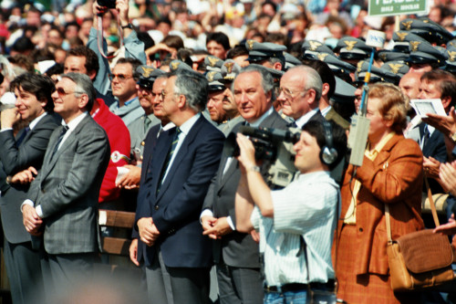 Carlo Bernini (al centro) e Umberto Carraro (a sinistra) tra i fedeli e i giornalisti giunti presso Col Cumano in occasione della visita di Papa Giovanni Paolo II
