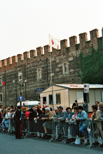 Il pubblico di fedeli riunito in Piazza Brà a Verona in occasione della visita pastorale di Papa Giovanni Paolo II
