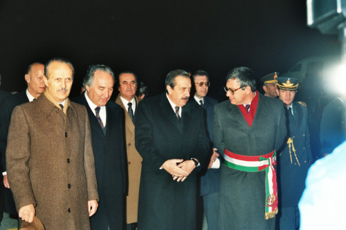 L'arrivo del Presidente della Repubblica Argentina Raùl Ricardo Alfonsin (al centro) all'aeroporto di Tessera nel 1987; ad accoglierlo (da sinistra) Giovanni Lanna, il Presidente della Regione Venento Carlo Bernini e il Sindaco di Venezia Nereo Laroni