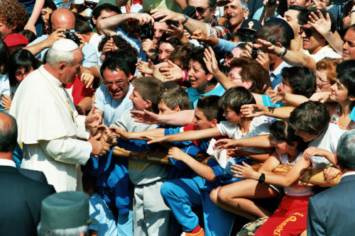 L'arrivo di Papa Giovanni Paolo II e il suo saluto al pubblico di fedeli presso Col Cumano in occasione del suo incontro con la Diocesi e di Belluno - Feltre