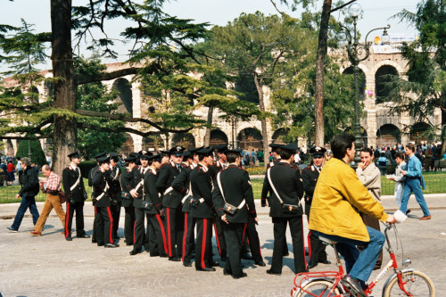 Un gruppo di Carabinieri fotografati in Piazza Brà a Verona in occasione della visita pastorale di Papa Giovanni Paolo II