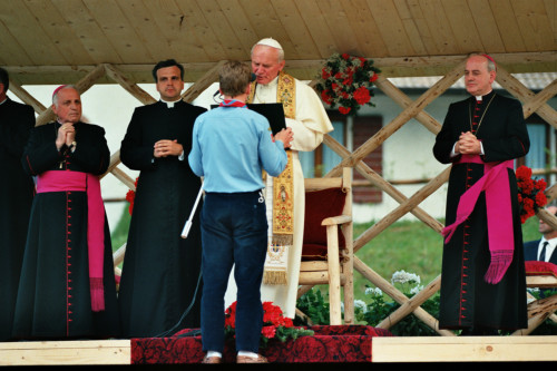 Papa Karol Wojtyla durante il suo discorso in occasione dell'incontro con la diocesi di Belluno - Feltre a Col Cumano; alla sua sinistra il Vescovo Ducoli Maffeo