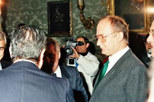 Il Presidente della Repubblica Argentina Raùl Ricardo Alfonsin in visita a Venezia nel 1987, mentre saluta alcuni esponenti politici