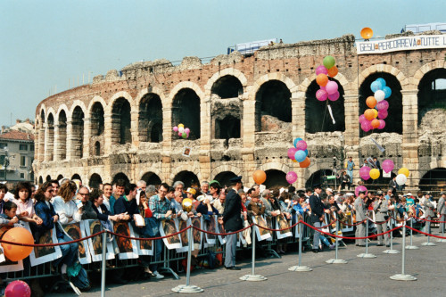 Il pubblico di fedeli riunito in Piazza Brà in occasione della visita pastorale di Papa Giovanni Paolo II