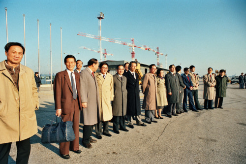 Visita del Presidente della Repubblica Popolare Cinese Li Xiannan a Venezia, ripreso in occasione del suo arrivo all'aeroporto di Tessera, accolto dal Sindaco di Venezia Nereo Laroni e dal Prefetto Ugo Trotta. Nella fotografia gli uomini che giunsero in Italia con il Presidente.