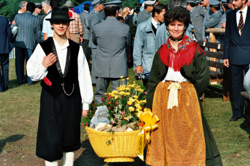Ritratto di giovani ragazzi vestiti con abiti tradizionali in attesa dell'arrivo di Papa Giovanni Paolo II presso Col Cumano in occasione della visita alla Diocesi e di Belluno - Feltre