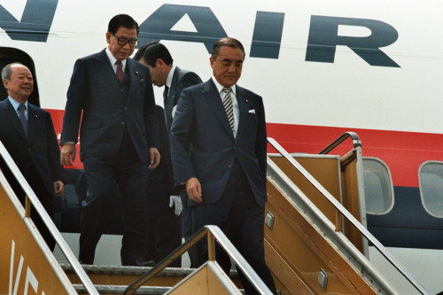 Servizio fotografico ripreso durante l'arrivo di Yasuhiro Nakasone presso l'aeroporto di Tessera, in occasione della sua partecipazione al summit del Gruppo dei Sette, Venezia nel 1987