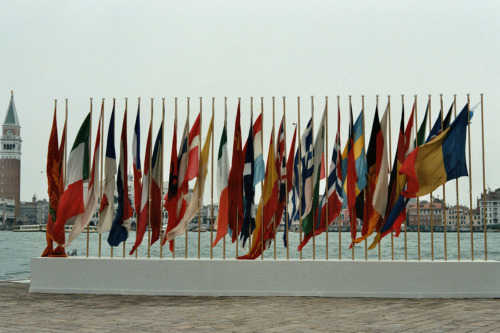Prima fotografia delle bandiere dei paesi partecipanti alla conferenza. Alle spalle il Canale della Giudecca. Più dietro si intravede il Campanile di San Marco, Venezia
