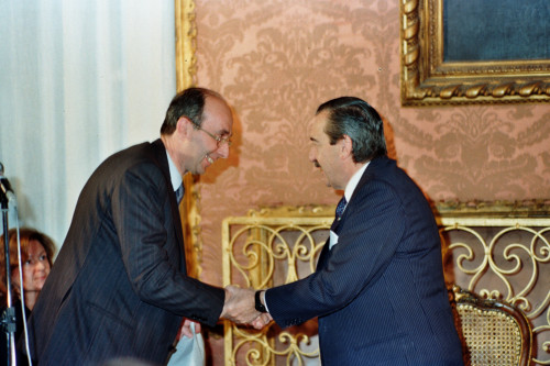 Il Presidente della Repubblica Argentina Raùl Ricardo Alfonsin (a destra)in visita a Venezia nel 1987, al termine dell'intervento di Giovanni Castellani Rettore di Ca' Foscari