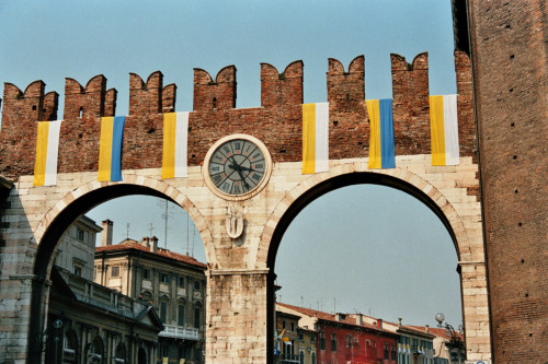 La Porta dell'orologio in Piazza Brà a Verona fotografata in occasione della visita pastorale di Papa Giovanni Paolo II