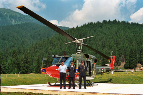 L'elicottero dell'Aeronautica Militare e l'equipaggio impegnato nel trasporto di Papa Giovanni Paolo II dall'Aeroporto militare di Treviso a Lorenzago di Cadore in occasione delle sue vacanze estive
