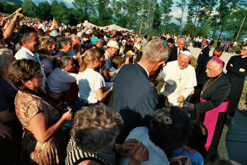 Papa Giovanni Paolo II accompagnato da il Vescovo Ducoli Maffeo (a destra)durante l'incontro con i fedeli della Diocesi e di Belluno - Feltre