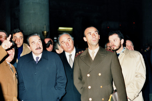 Il Presidente della Repubblica Argentina Raùl Ricardo Alfonsin (al centro)a Venezia nel 1987, in visita la Basilica di Santa Maria Gloriosa dei Frari, accopagnato dal Presidente della Regione Veneto Carlo Bernini (a destra)