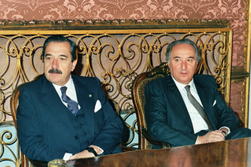 Il Presidente della Repubblica Argentina Raùl Ricardo Alfonsin (a sinistra)in visita a Venezia nel 1987, al termine dell'intervento di Carlo Bernini Presidente della Regione Veneto (a destra)