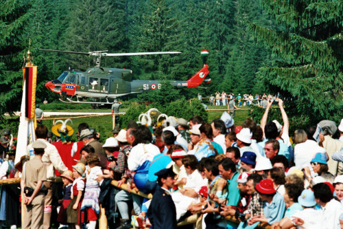 L'atterragio dell'elicottero dell'aeronautica militare con a bordo Papa Giovanni Paolo II presso Col Cumano in occasione del suo incontro con la Diocesi e di Belluno - Feltre