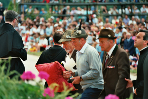 Gli Alpini portano una colomba bianca per la benedizione di Papa Karol Wojtyla durante l'incontro con la diocesi di Belluno - Feltre a Col Cumano