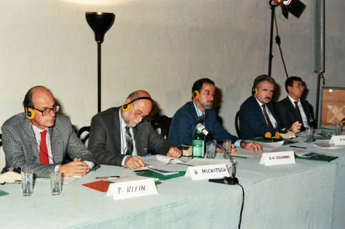 Seduti al tavolo della conferenza, da sinistra a destra si possono riconoscere: P. Klein; H. Michitsch; G.A. Colombo; altri due conferenzieri