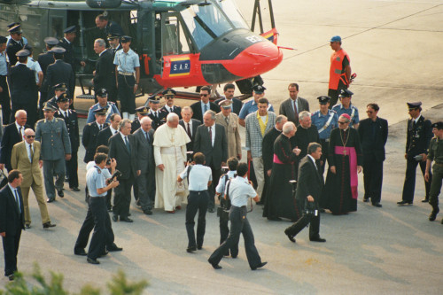 Papa Giovanni Paolo II giunto all'aeroporto di Istrana da Lorenzago di Cadore con l'elicottero dell'aeronautica militare al termine delle vacanze estive passate in Cadore, da qui il Papa sarebbe salito sul jet per Roma