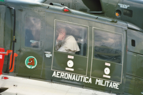 La partenza in elicottero di Papa Giovanni Paolo II da Pramarino in Val Visdende a seguito della sua visita