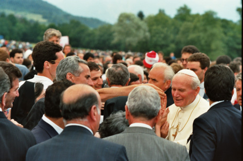 Papa Giovanni Paolo II tra il pubblico in occasione del suo incontro con i fedeli della Diocesi e di Belluno - Feltre