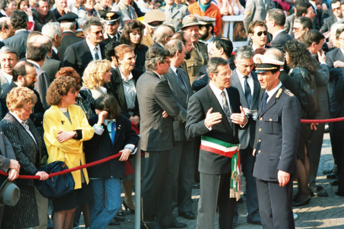 Gabriele Sboarina sindaco di Verona, tra il pubblico di fedeli riunito in Piazza Brà in occasione della visita pastorale di Papa Giovanni Paolo II