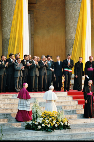 Papa Giovanni Paolo II, saluta il pubblico di fedeli, accanto alle autorità civili riunitisi presso Palazzo Barbieri in occasione della sua visita a Verona;