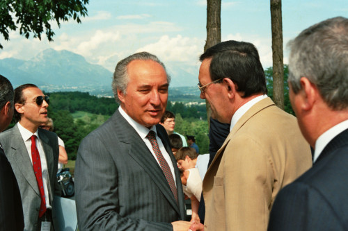 Carlo Bernini, Presidente della Regione Veneto, mentre saluta alcuni dei partecipanti all'incontro di Papa Giovanni Paolo II con la Diocesi e di Belluno - Feltre