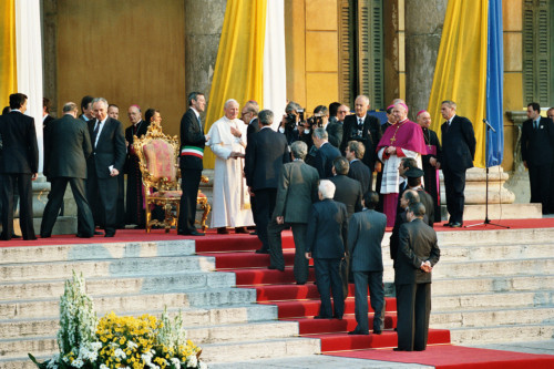 Papa Giovanni Paolo II saluta le autorità civili riunitisi presso Palazzo Barbieri in occasione della sua visita a Verona;