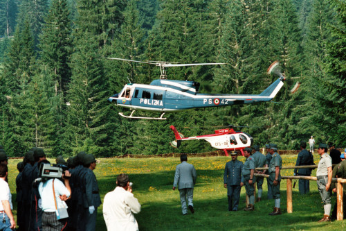Alcuni elicotteri della polizia impegnati alla perlustrazione in occasione dell'incontro presso Col Cumano di Papa Giovanni Paolo II con la Diocesi e di Belluno - Feltre