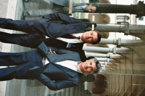 Fotografia di due uomini davanti alla porta di vetro nel chiostro del convento di San Giorgio, Venezia