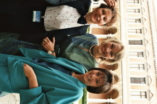 Primo piano di tre donne che sorridono nel giardino del chiostro benedettino del convento di San Giorgio, Venezia