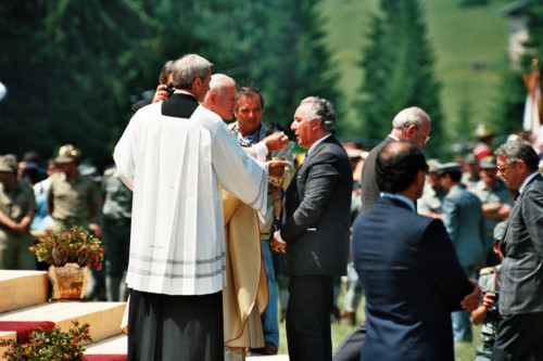 Papa Giovanni Paolo II durante la celebrazione dell'eucarestia presso Col Cumano in occasione del suo incontro con la Diocesi e di Belluno - Feltre; in questo fotografia è ritratto Carlo Bernini