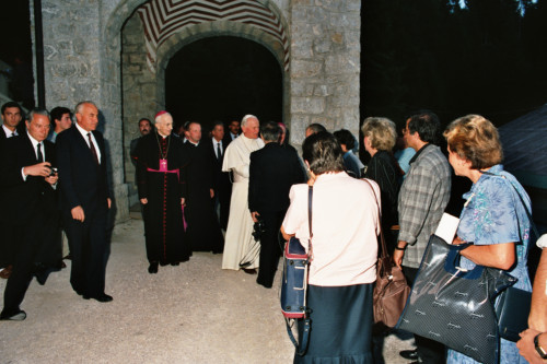 Papa Giovanni Paolo II incontra le persone che si sono riunite presso le mura del castello di Mirabello, dove il Pontecifice avrebbe soggiornato per 9 giorni in occasione del proprio soggiorno estivo nel Cadore; ad accompagnarlo il Vescovo di Treviso Antonio Mistrorigo