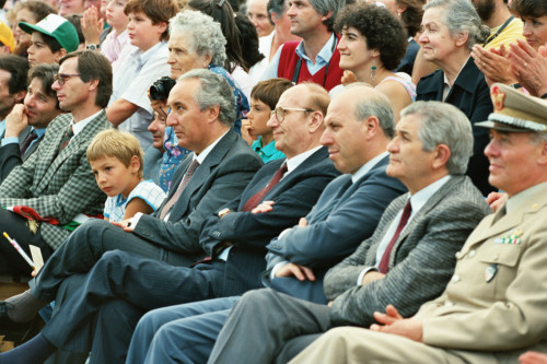 (da sinistra) Umberto Carraro, Mario Tremonti sindaco di Lorenzago di Cadore e Carlo Bernini Presidente della Regione Venento tra il pubblico in occasione dell'incontro tra Papa Giovanni Paolo II e i fedeli della Diocesi e di Belluno - Feltre