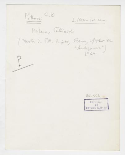 Riproduzione fotografica del San Rocco dipinto da Giambattista Pittoni, esposto a Roma in occasione della Mostra di pittura veneziana del Settecento, "Antiquaria" (1941-1942), registrato in collezione privata milanese da Franca Zava Boccazzi (1979, p. 143, cat. 116).