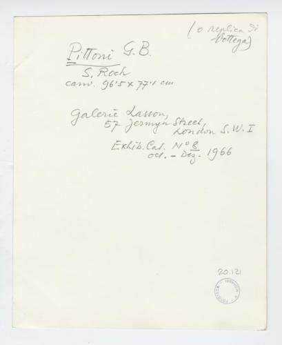 Riproduzione fotografica del dipinto già in Galleria Lasson a Londra (1966), replica del San Rocco di Giambattista Pittoni conservato all'Accademia dei Concordi di Rovigo (Zava Boccazzi 1979, p. 184, cat. 257).