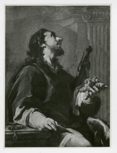 Riproduzione fotografica di uno dei due dipinti di Giambattista Pittoni raffiguranti san Rocco, oggi conservati al Szépművészeti Múzeum di Budapest, pubblicati da André Pigler nel Bollettino del Museo (1949). L'estratto del contributo di Pigler venne inserito da Antonio Morassi nella cartella "G.B. Pittoni".