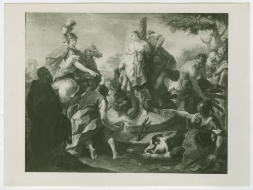 Riproduzione fotografica del dipinto di Giambattista Pittoni raffigurante Clorinda libera Olindo e Sofronia dal rogo, conservato al Museo Civico di Vicenza, Pinacoteca di Palazzo Chiericati (Zava Boccazzi 1979, pp. 179-180, cat. 241).