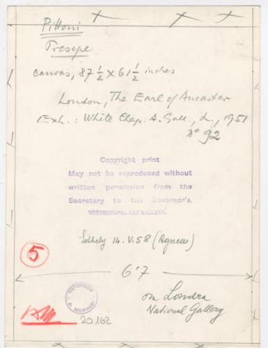 Riproduzione fotografica del dipinto di Giambattista Pittoni raffigurante la Natività di Gesù, ora alla National Gallery di Londra, prima della pulitura (Zava Boccazzi 1979, p. 136, cat. 87).