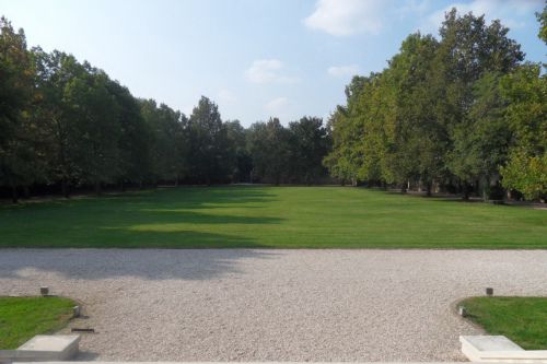Lattuale sistema degli ingressi (quello principale è laterale) suddivide larea verde in due settori principali, tra loro uniti senza soluzione di continuità: verso il fiume (prospetto sud-orientale della villa, in origine la facciata principale) si sviluppa oggi un piccolo giardino delimitato dallalto muro di recinzione che funge anche da struttura di contenimento dellargine fluviale; sul lato opposto (prospetto nord-occidentale) si apre unampia corte-giardino di forma quadrangolare, cinta da muro e ben definita su tre lati da un filare di alti platani.