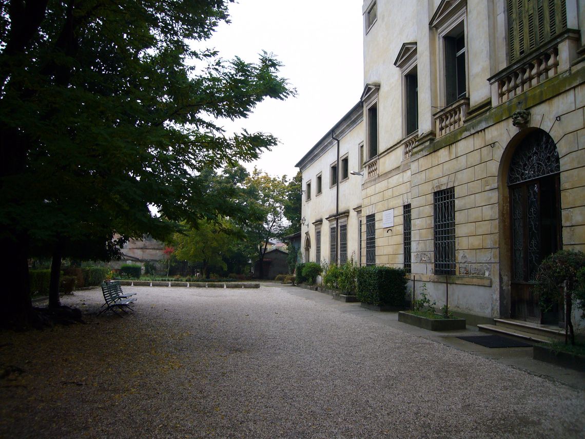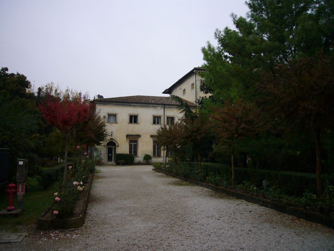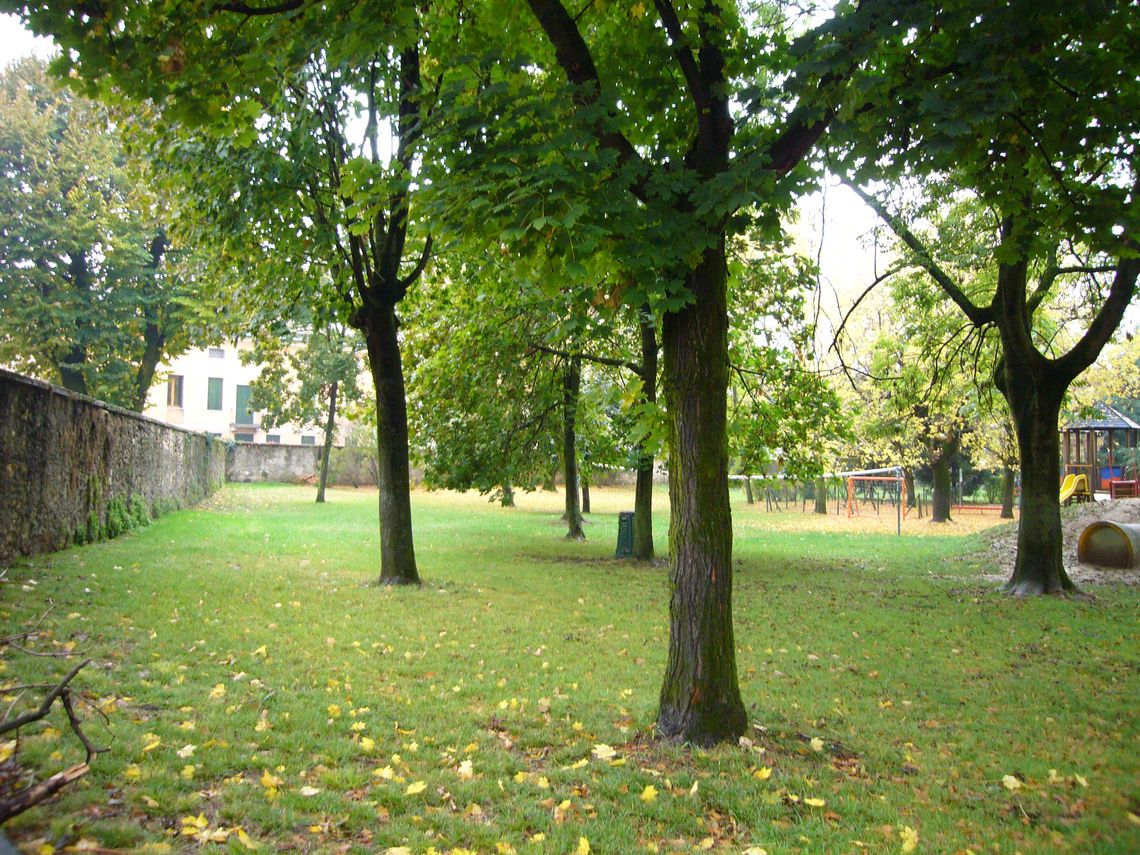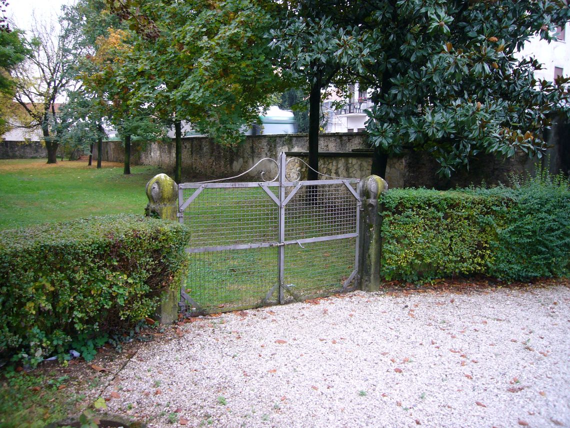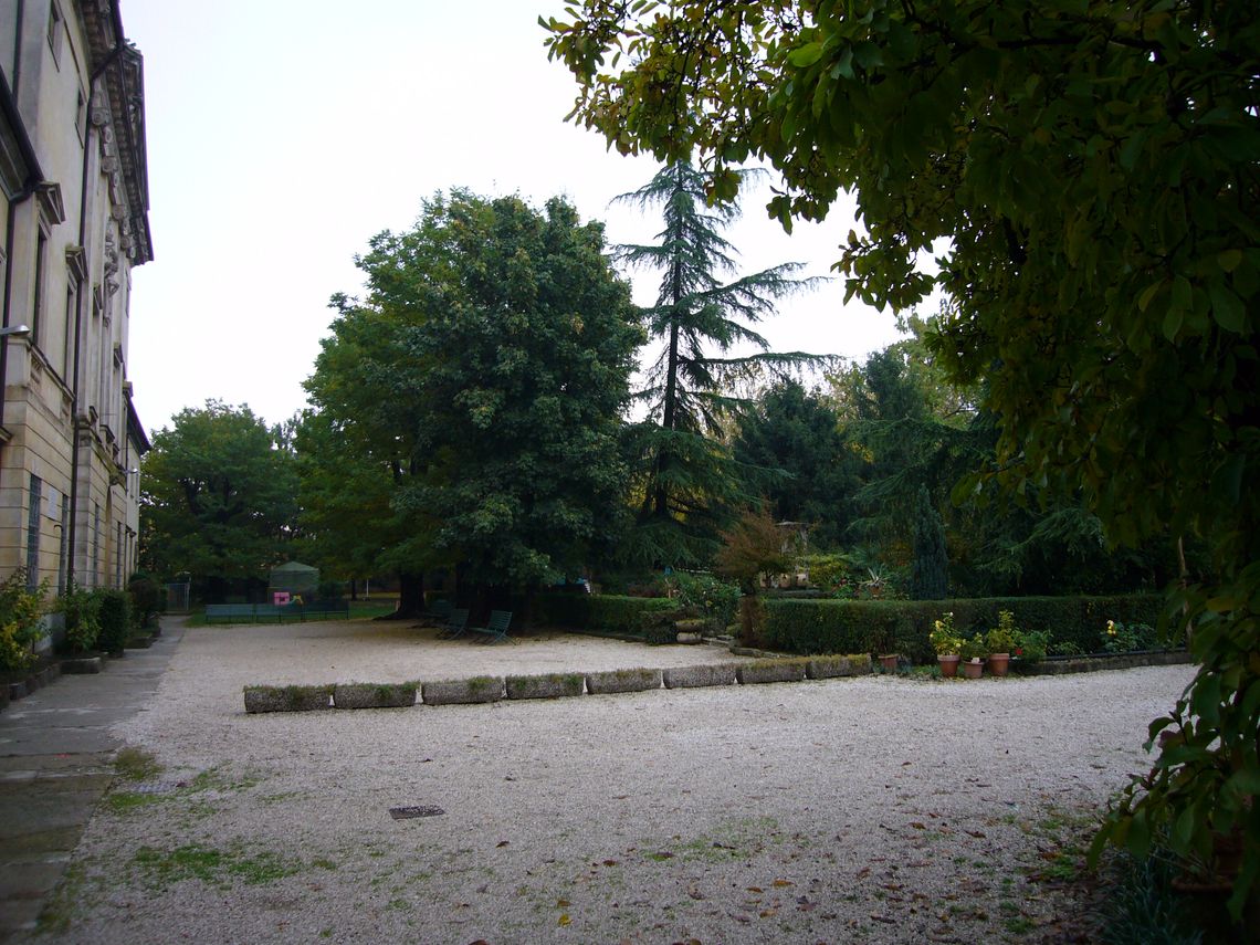Giardino antistante la villa recintato da un muro e zona verde adibita a parcheggio nella zona retrostante con ingresso da via cipro 10.