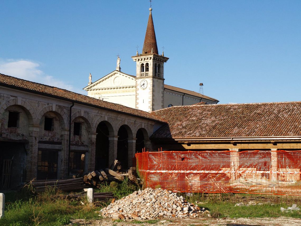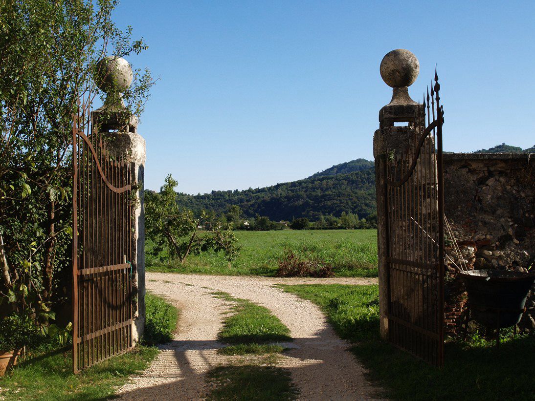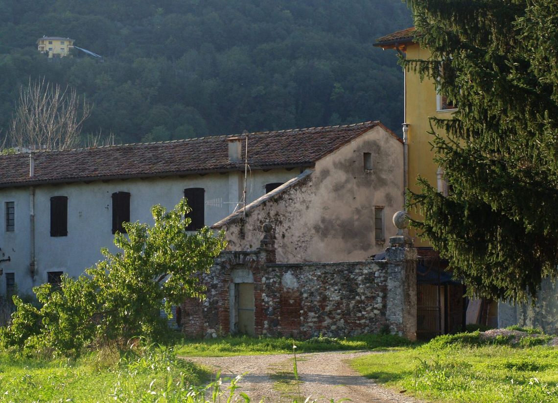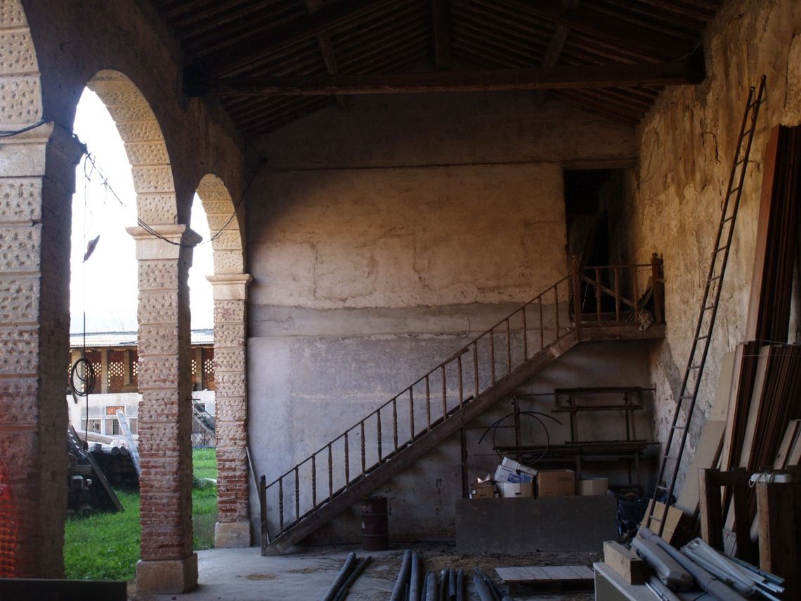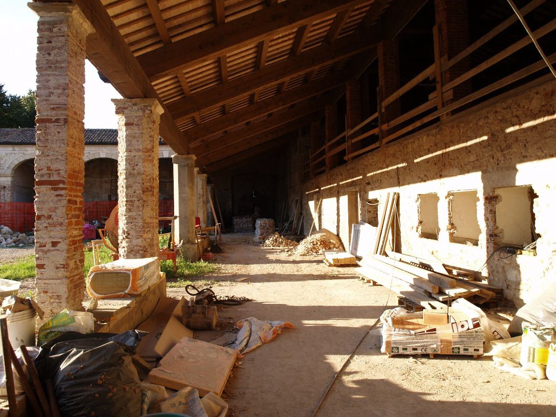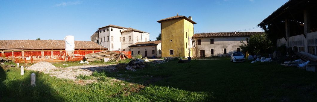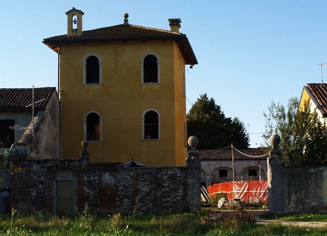 La villa si articola nel suo retro assieme alle barchesse in un corpo a L che racchiude, assieme ad altri annessi di scarso valore e ad una colombara di recente restauro l'ampia corte rurale con aia pavimentata in cotto. Giardino e proprietà terriera si estendevano verso Sud.