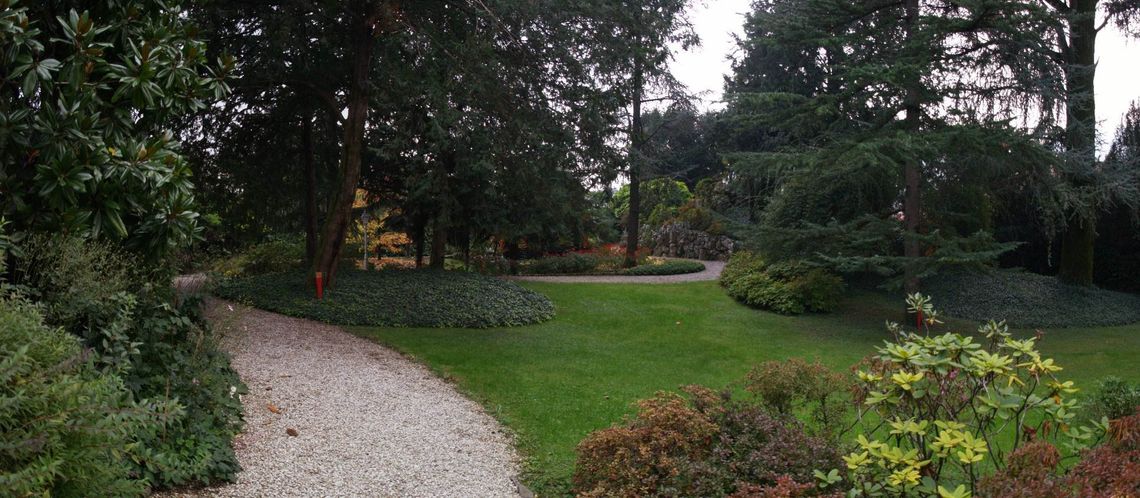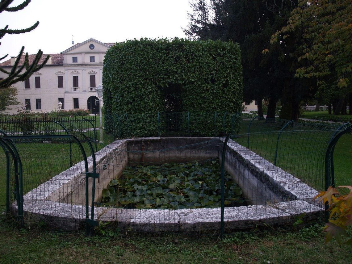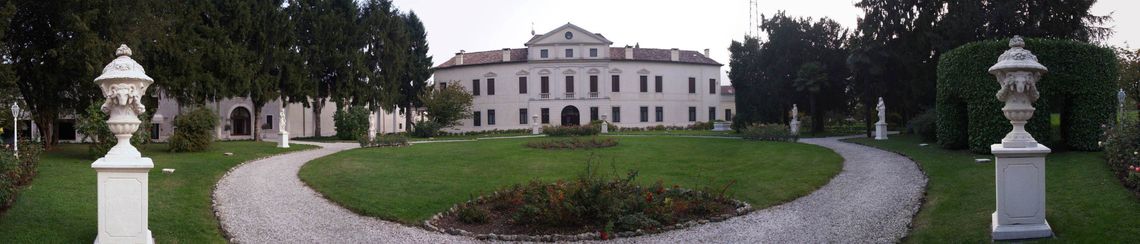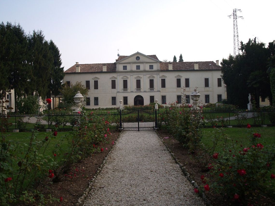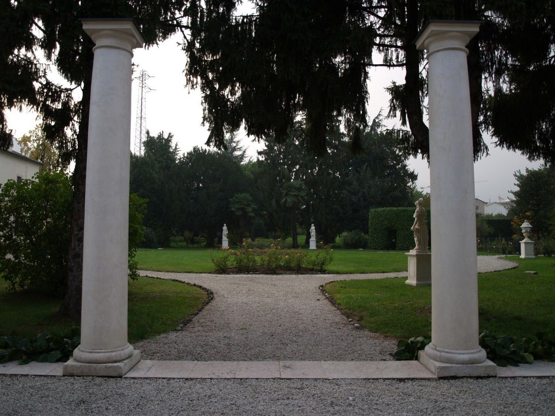 Il complesso si compone di vari edifici separati, come la casa padronale prolungata dalle ali con affaccio su strada (a Sud) e gli annessi rustici (ad Est), la fila di colonne doriche libere a testimonianza del portico bruciato a inizi '900 e la Chiesetta di San Francesco, con fronte sulla pubblica via. Negli spazi verdi della Villa vengono ben rappresentate due importanti tipologie dellarchitettura da giardino: il giardino di gusto italiano del fine 700 dislocato sul fronte interno del complesso e impreziosito dalla serra e il parco romantico inglese della II metà dellOttocento adiacente alla chiesetta, oltre la strada. Il primo, si distende in un ampio parterre contornato da passaggi in ghiaino, fiancheggiato da alti alberi secolari ben si accosta ai broli, un tempo ricchi di alberi da frutto. Il secondo si snoda tra sinuosi percorsi che assecondano le diverse quote altimetriche del terreno in una ambientazione solo apparentemente spontanea dalla dialettica "sauvage" (selvatica) e "peignè" (pettinata).