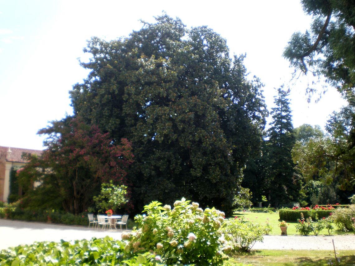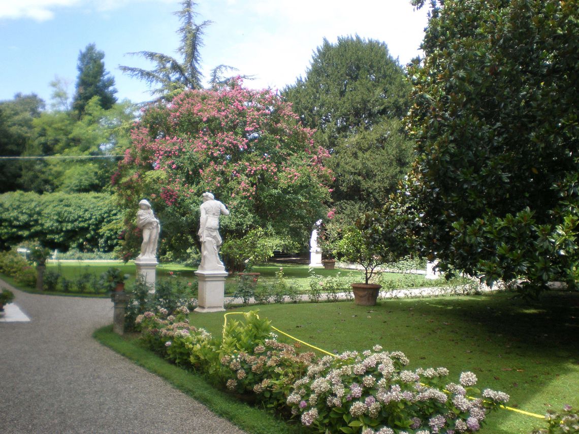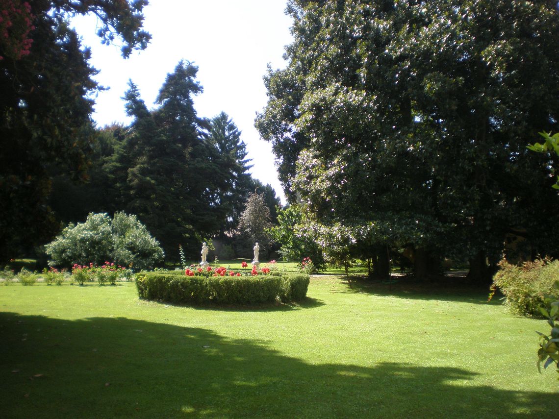 Più piccolo, il giardino prospiciente il fronte posteriore della villa presenta anch'esso una forma trapezoidale, racchiuso sui tre lati rimanenti dal muro di cinta del complesso.