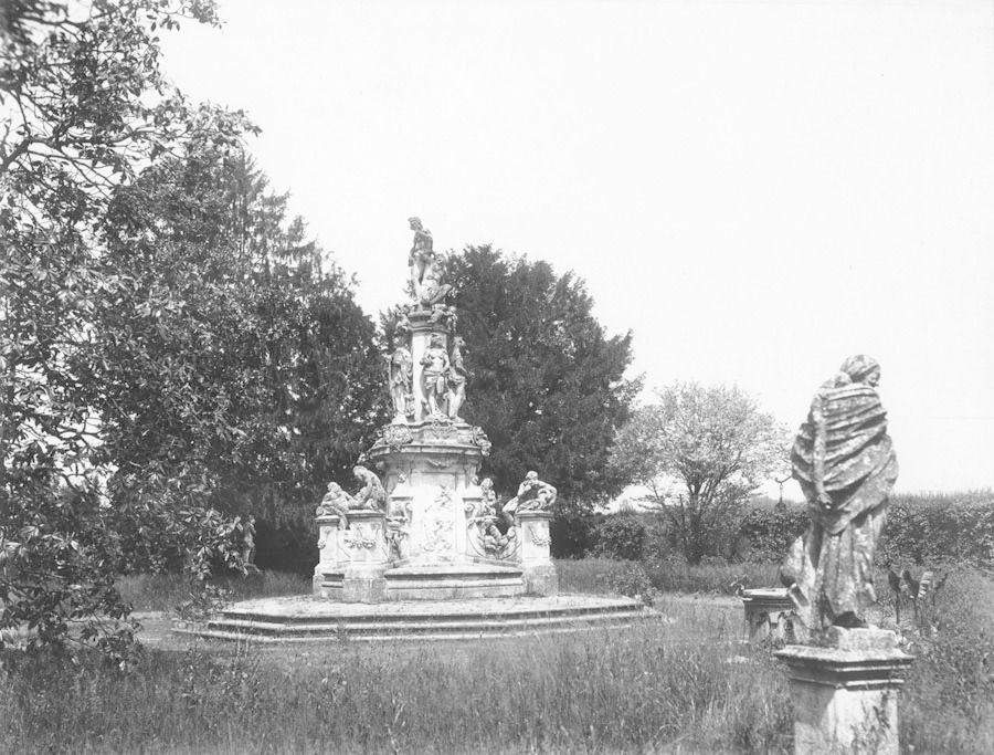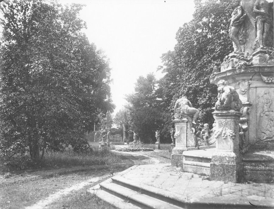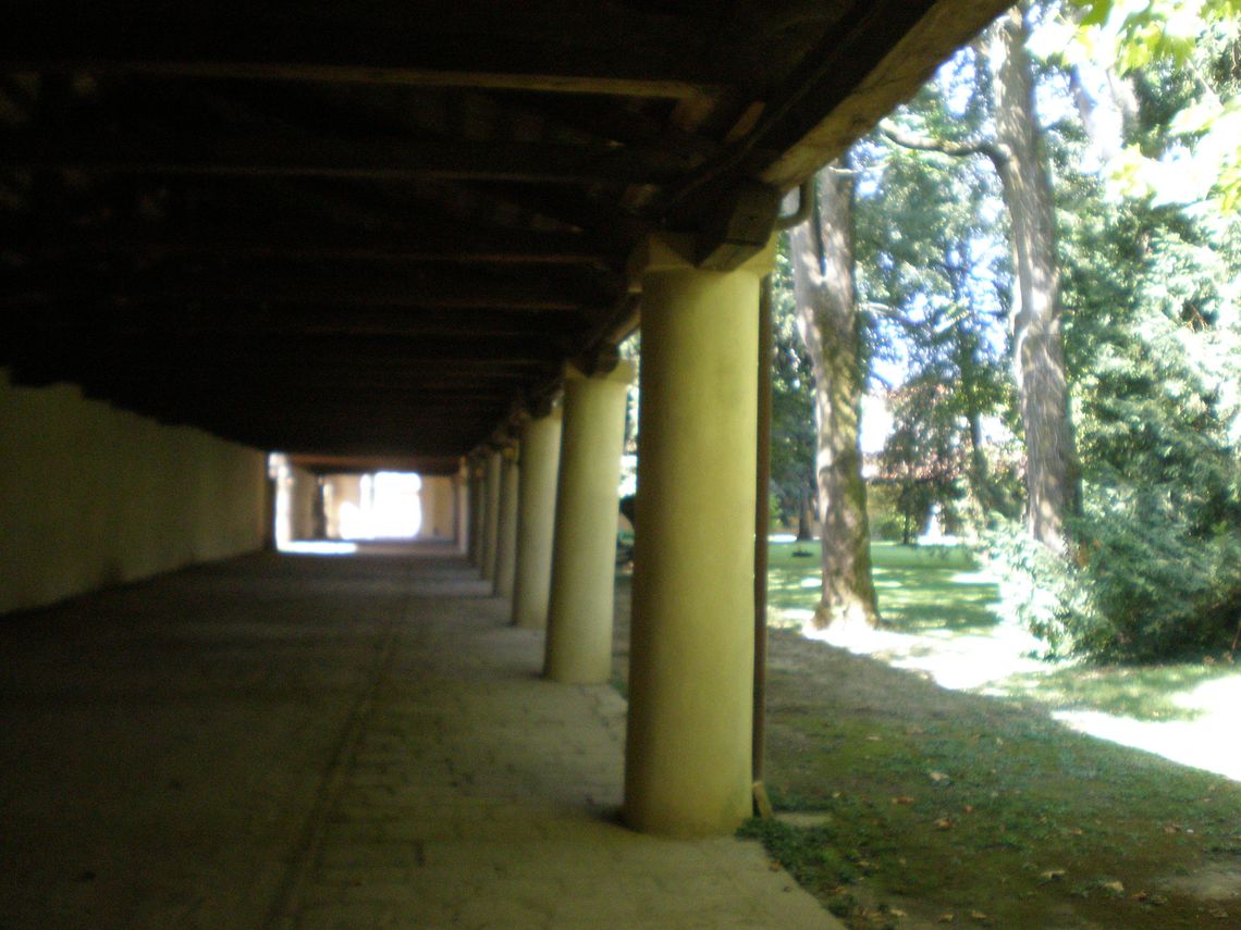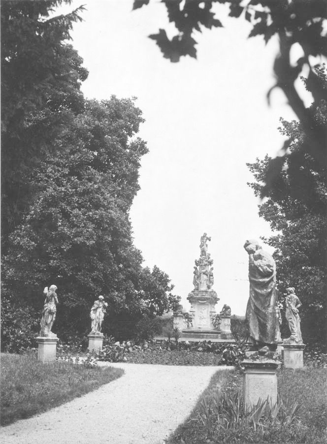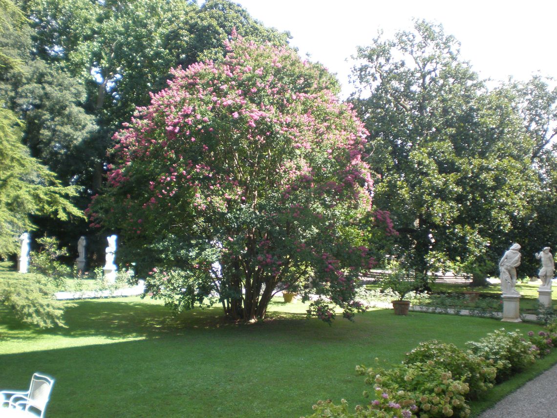 Più piccolo, il giardino prospiciente il fronte posteriore della villa presenta anch'esso una forma trapezoidale, racchiuso sui tre lati rimanenti dal muro di cinta del complesso.