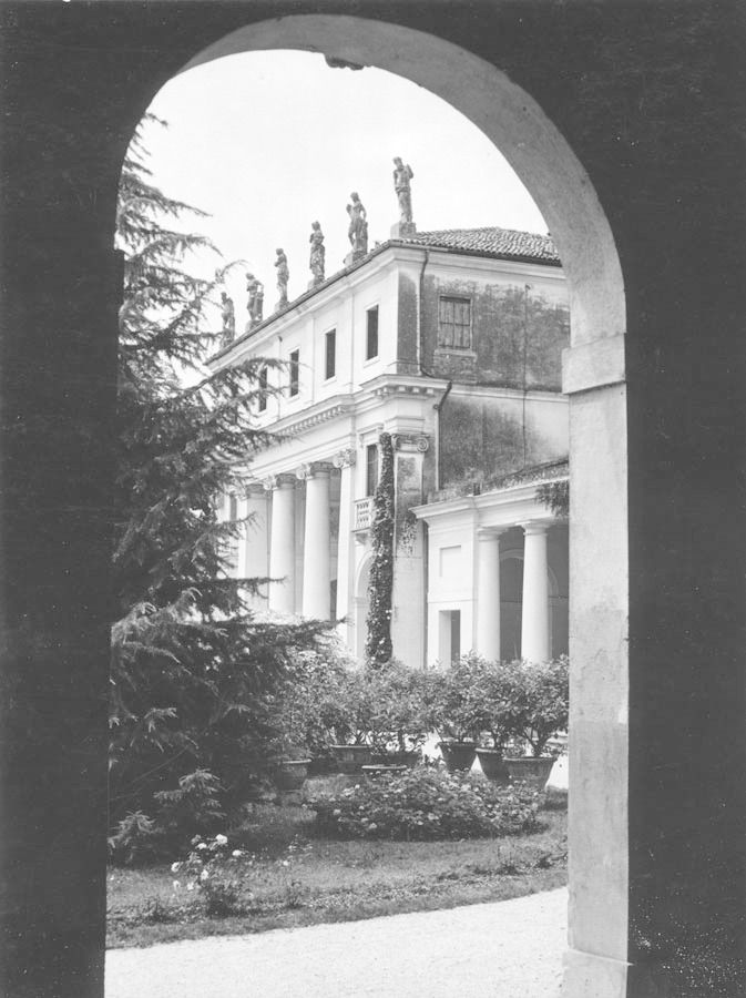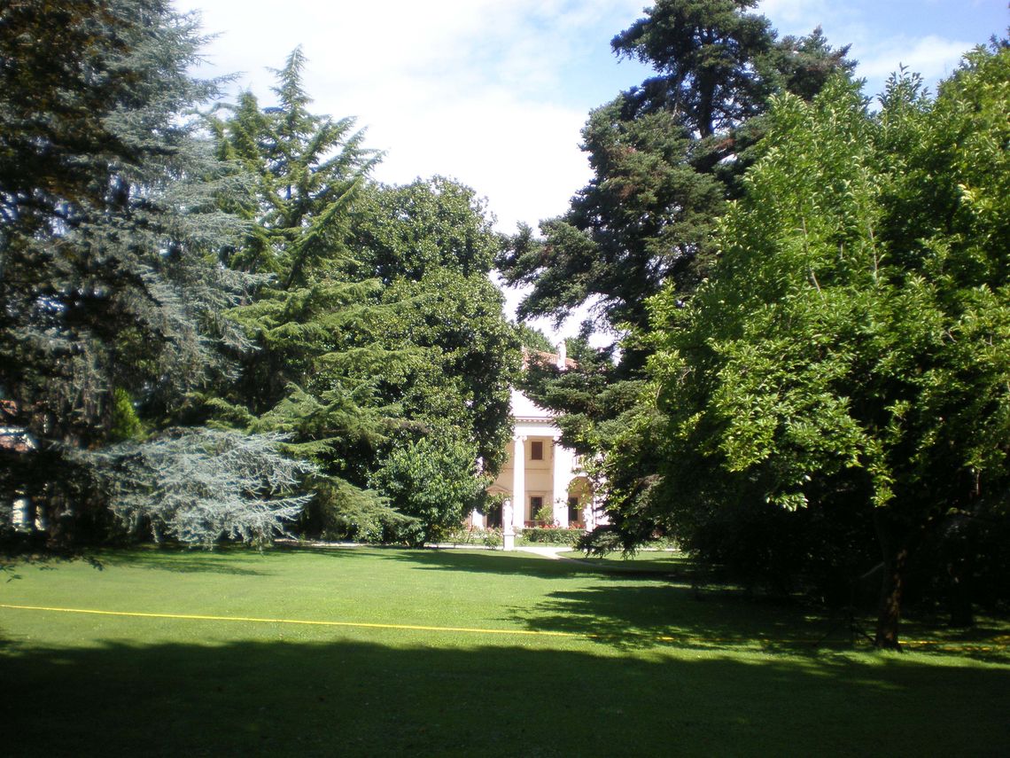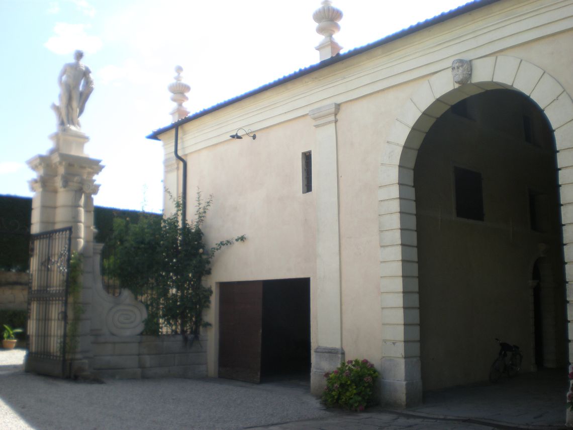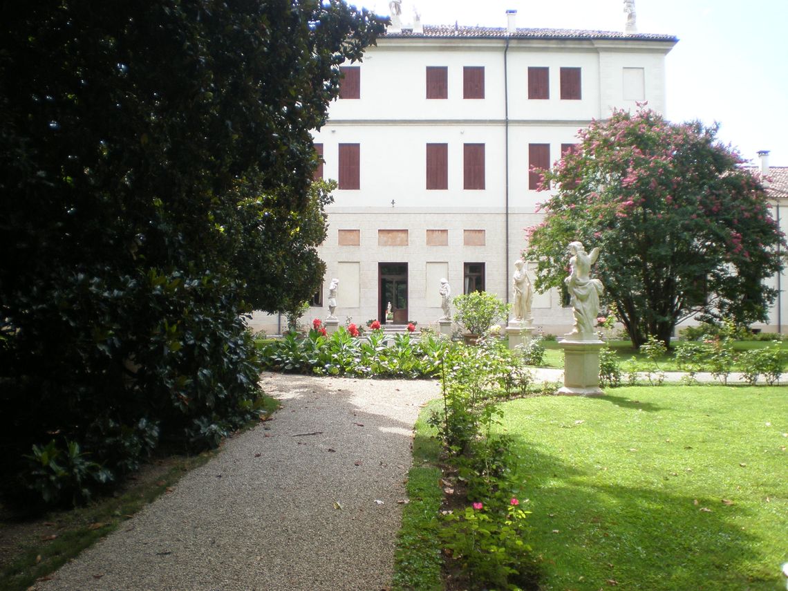 La corte-giardino antistante la villa presenta una forma trapezoidale. Il complesso della villa, posto a nord, assieme agli altri edifici disposti intorno, racchiude l'area verde a guisa di corte trapezoidale. L'ala padronale è stata progettata in maniera monumentale con un portico di ordine ionico a doppia altezza che porta un attico; il corpo principale è affiancato da ali basse porticate, che proseguono sugli altri lati, interrotte sul lato sud-ovest da un cancello in ferro battuto. Un altro cancello settecentesco in ferro battuto si trova sul lato nord-orientale della corte in prossimità della barchessa e collega la corte-giardino al fiume Bacchiglione; all'angolo sud si trova la cappella gentilizia.